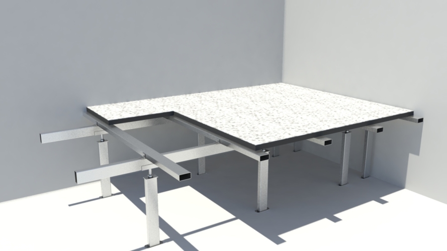 Каждая напольная плита представляет собой пластину из ДСП, которая завёрнута в защищённую цельнометаллическую оболочку толщиной от 23 мм и более.