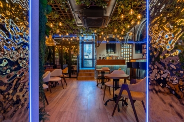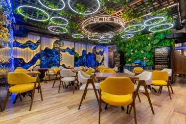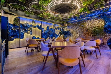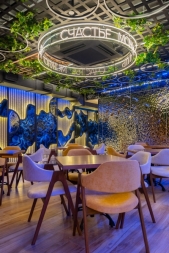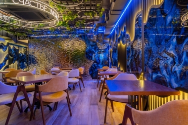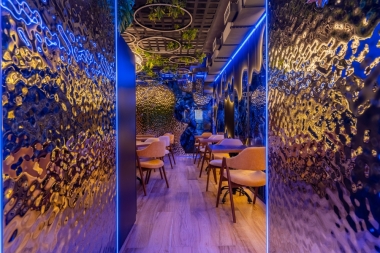 Наша компания K&R Design выполнила все работы, связанные с отделкой потолков и стен панелями из нержавеющей стали с эффектом водной ряби в двух цветах: серебряный и золотой.