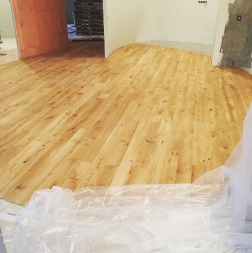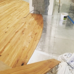 Нестандартная форма покрытия в виде "яйца" посредине помещения добавляет сложность конструкции. Поскольку толщина ковровой плитки и инженерной доски отличается, фальшпол (основа) был смонтирован в двух уровнях.