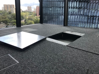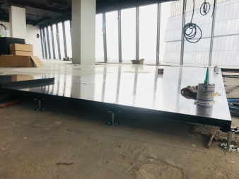 Монтаж фальшпола из ДСП 38 мм с алюминиевым покрытием сверху и снизу.