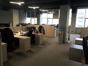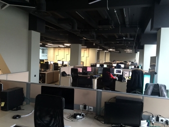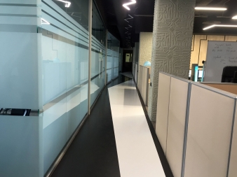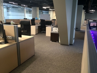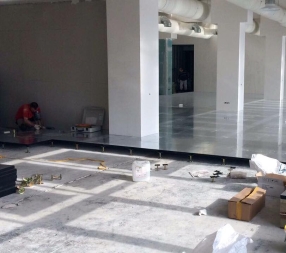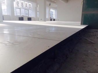 Фальшпол смонтирован на разной высоте для того, чтобы состыковать разные финишные покрытия ковролин и наливной пол. По задумке архитекторов перегордки стоят не в одну линию, а криволинейно соотвественно неразъёмный фальшпол также смонтирован повторяя сложную расстановку перегородок согласно по проекту.