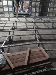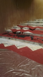 Монтаж усиленной каркасной системы и использованием С-профиля по наклонному основанию чернового пола с последующим монтажом плиты неразъемного фальшпола из сульфата кальция (КМ0) K&R Design SLock36st/k и наклейкой ковровой плитки с декоративным алюминиевым уголком в зрительном зале Третьяковской галереи.