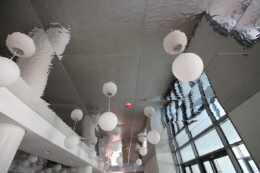 «Водная рябь» система потолочных панелей из нержавеющей стали, благодаря рельефу поверхности и шлифовке, при попадании света на них создают неповторимый «эффект бликов от водной поверхности».