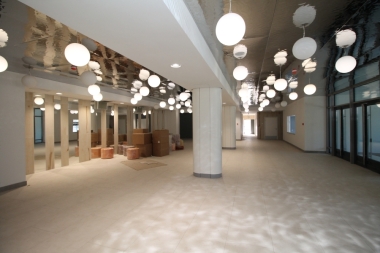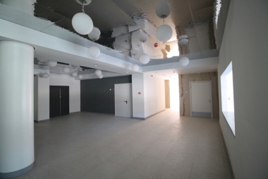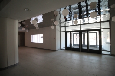 Облицовка козырька осуществлена зеркальными панелями по торцу и потолочными панелями кассетного типа облицована часть потолочного пространства над парадным входом в здание.