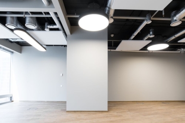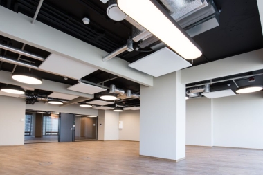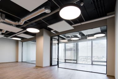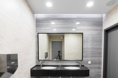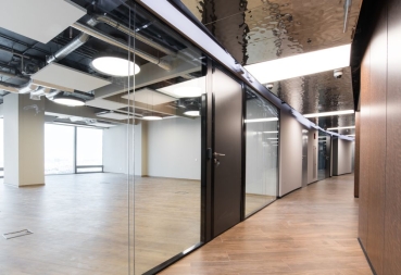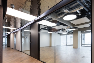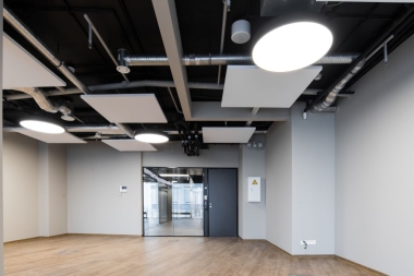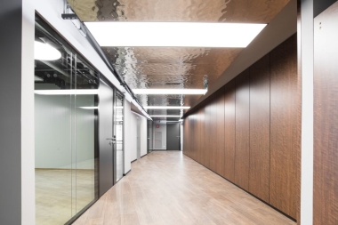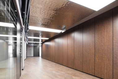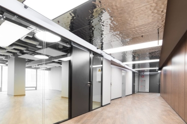 По заданию архитекторов было применено оригинальное (эксклюзивное) решение - изготовлен потолок hook-on из полированной стали.