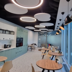 Наша компания осуществила поставку и монтаж акустических островов и светильников торговой марки K&R Design для зоны кафе в офисе OZON.