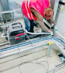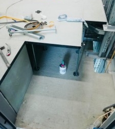 Сложное техническое помещение с развитой системой коммуникаций. Монтаж усложнялся тем, что нужно было совместить схему прокладки коммуникаций с сеткой фальшпола. В карусели видно как много проводов и коммуникаций можно скрыть под системой фальшпола.