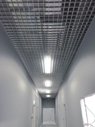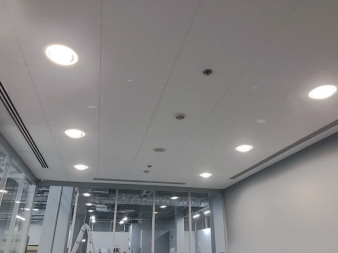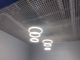 Монтаж потолков Rockfon Blanka с кромкой Х в Cyberspace ТЦ Ривьера. Потолочная панель Rockfon Blanka - инновационные потолочные панели дизайн класса с матовой гладкой супербелой поверхностью из каменной ваты со стеклотканью, окрашенные специальной акустической краской, светоотражение 87% и рассеивание света более 99%, звукопоглощение класса А, антистатическая поверхность, повышенная прочность и устойчивость покрытия к очистке щеткой во влажном состоянии.