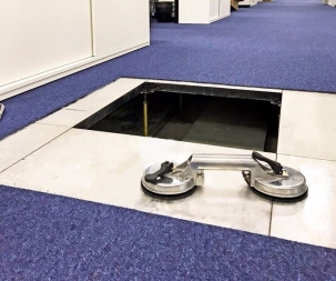 В проекте, как и во многих других офисных помещениях, применялся фальшпол из ДСП K&R Design толщиной 38 мм с алюминиевым листом сверху и снизу (порядка 600 кв.м).