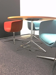 Офис выполнен в формате open space, поэтому в пространстве под фальшполом расположено огромное количество лотков для проводов и кабелей, а также в плитах фальшпола врезаны напольные лючки для доступа к розеткам.